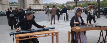 凱旋門下,神奇的一幕發生了,中國藝術家和法國軍樂隊同框演奏,巴黎街頭同時回蕩著中法兩國的音樂聲。