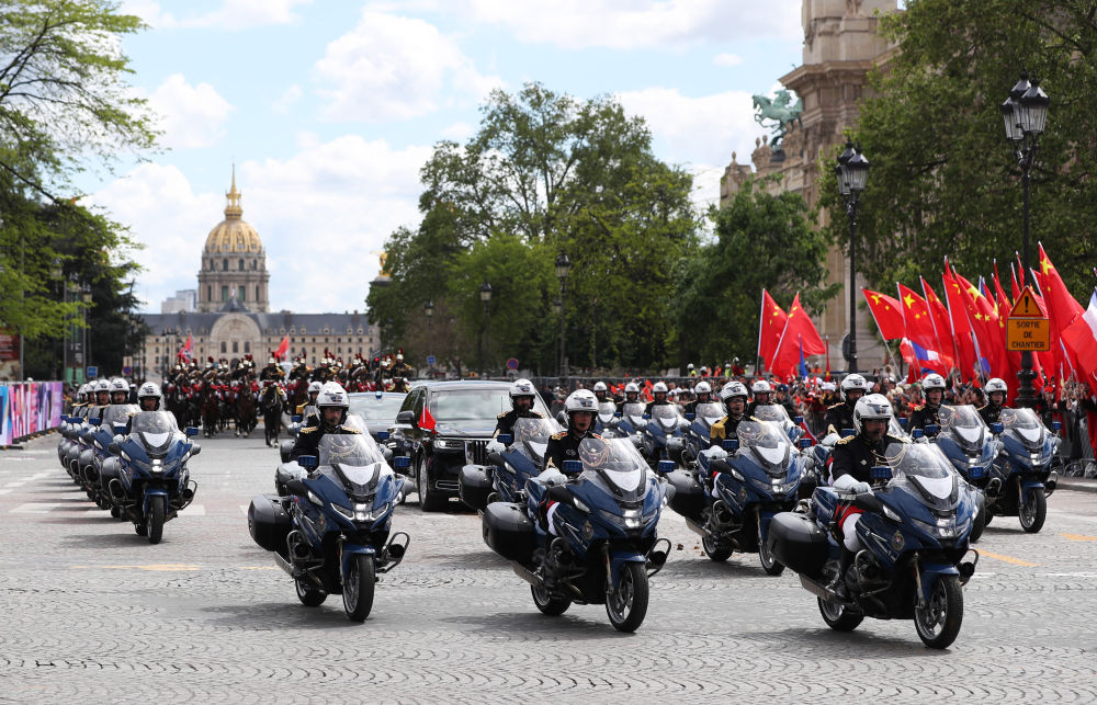 歡迎儀式后,習近平和彭麗媛在共和國衛隊148名騎兵組成的禮兵馬隊和摩托車隊護衛下,乘車前往愛麗舍宮。
