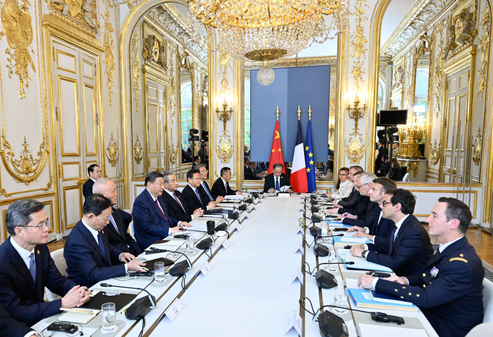 習近平指出,很高興在中法建交60周年之際對法國進行第三次國事訪問。中法關系60年珍貴歷程,將使我們更好思考如何開啟下一個60年。在當前世界百年變局下,雙方應該堅守獨立自主、相互理解、高瞻遠矚、互利共贏的建交初心,并為其注入新的時代內涵,打造新時期互信穩定、守正創新、擔當作為的中法關系。雙方要堅持獨立自主,共同防止“新冷戰”或陣營對抗;要堅持相互理解,共同促進多彩世界的和諧共處;要堅持高瞻遠矚,共同推動平等有序的世界多極化;要堅持互利共贏,共同反對“脫鉤斷鏈”。