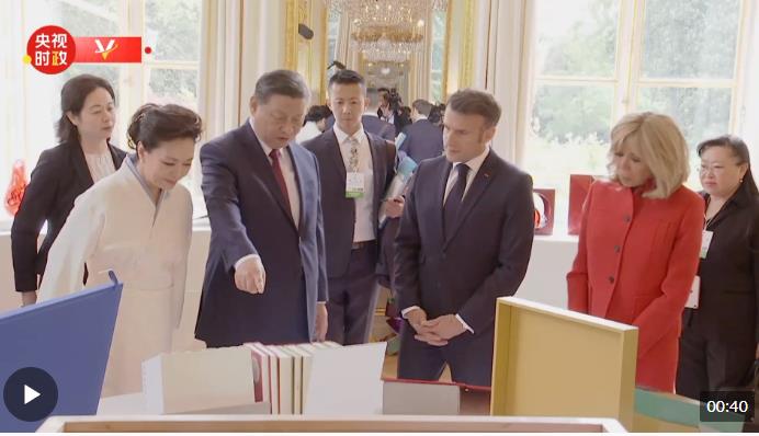 當(dāng)?shù)貢r間5月6日下午,國家主席習(xí)近平在巴黎愛麗舍宮同法國總統(tǒng)馬克龍舉行會談。會談前,習(xí)近平向馬克龍贈送圖書。