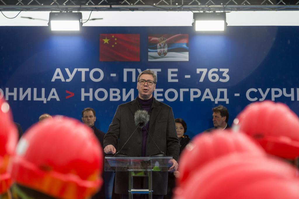 2023年4月1日,塞爾維亞總統武契奇在首都貝爾格萊德的塞爾維亞E763高速公路新貝爾格萊德-蘇爾欽段通車儀式上致辭。新華社記者石中玉攝
