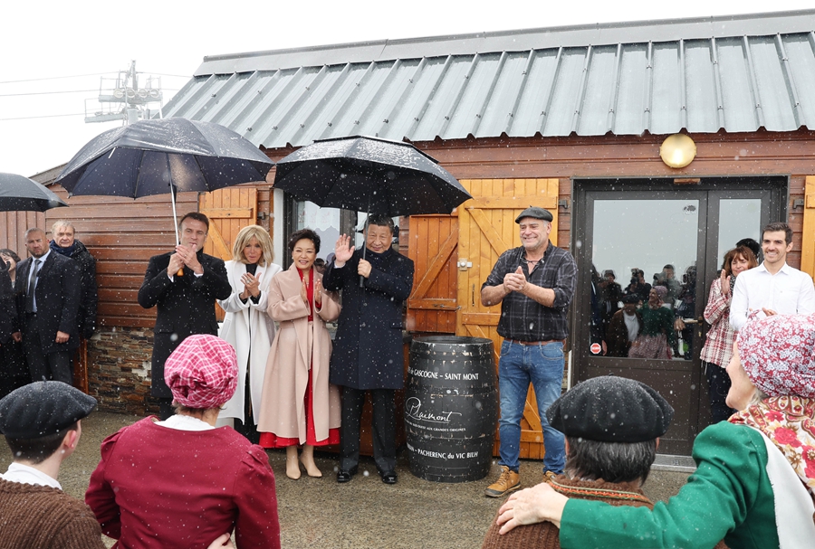 當?shù)貢r間5月7日,應法國總統(tǒng)馬克龍?zhí)貏e邀請,國家主席習近平乘專機來到法國西南部上比利牛斯省訪問。在圖爾馬萊山口“牧羊人驛站”,習近平和夫人彭麗媛同馬克龍和夫人布麗吉特共同欣賞當?shù)卮迕癖硌莸木哂袧庥裟戏L情的牧羊人之舞。新華社記者 姚大偉 攝