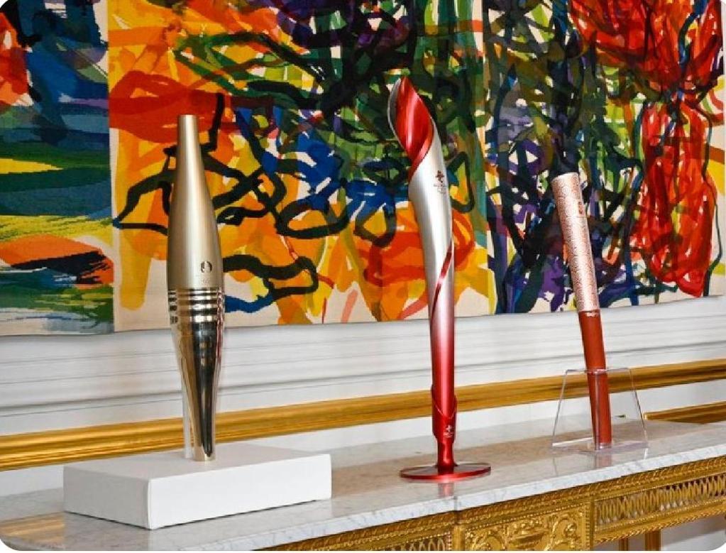 這是習近平主席同馬克龍總統會談前,兩國元首夫婦互贈的禮品之一。習近平主席贈送給馬克龍總統的是北京雙奧火炬,馬克龍總統則以巴黎奧運火炬回贈。