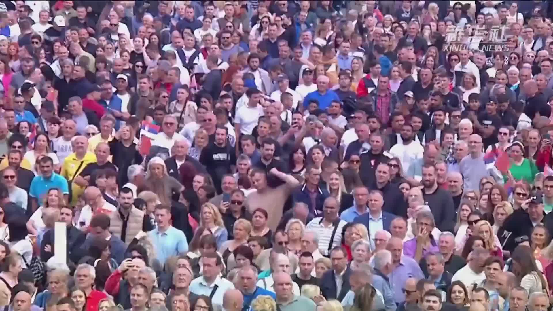 歡迎儀式結束后,他們穿過塞爾維亞大廈的大廳,走到另一側大門。大門外的廣場,人山人海,無比壯觀。
