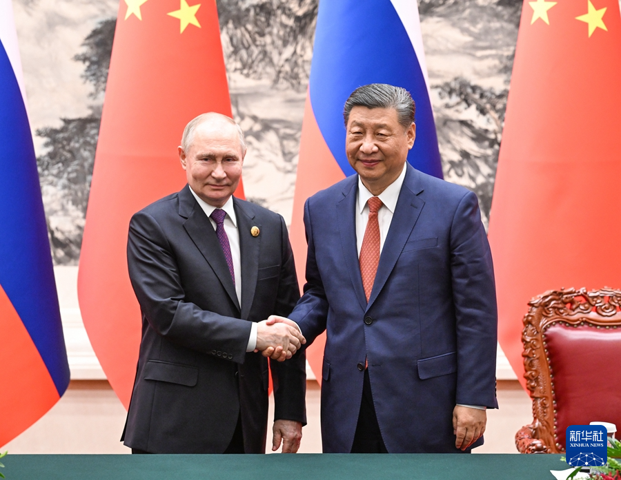 5月16日上午,國家主席習近平在北京人民大會堂同來華進行國事訪問的俄羅斯總統普京舉行會談。這是會談后,兩國元首共同簽署并發表《中華人民共和國和俄羅斯聯邦在兩國建交75周年之際關于深化新時代全面戰略協作伙伴關系的聯合聲明》。新華社記者 饒愛民 攝