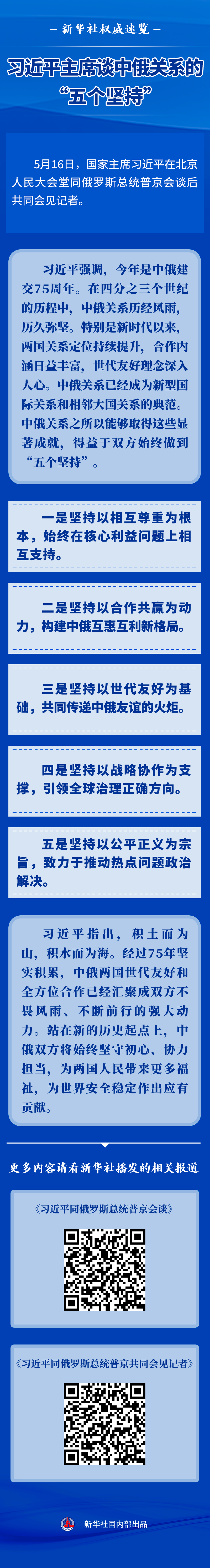 5月16日,國家主席習近平在北京人民大會堂同俄羅斯總統普京會談后共同會見記者。習主席談到中俄關系的“五個堅持”。