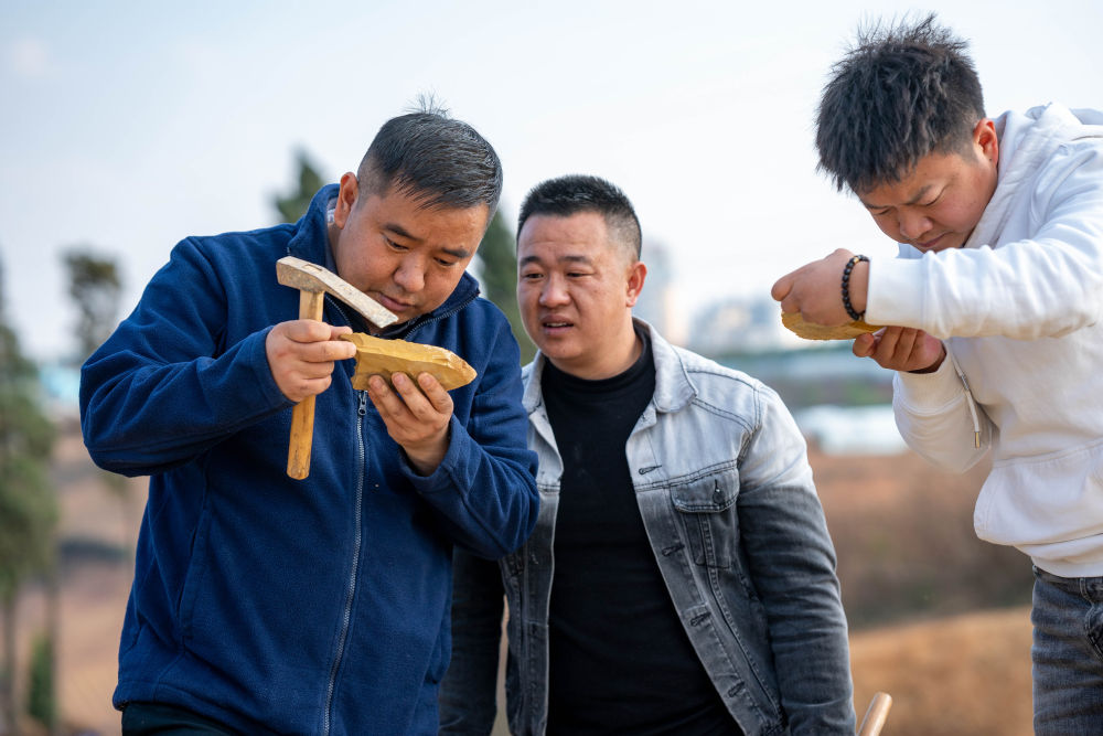 2024年2月22日,云南澄江化石地世界自然遺產(chǎn)博物館副館長郭進(左一)和同事在云南省澄江市黑蟆地查看采集到的化石標(biāo)本。