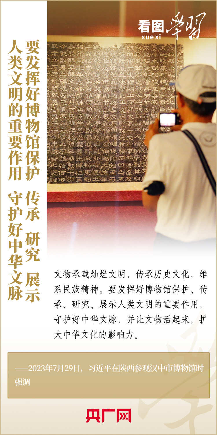 “一座博物館就是一所大學(xué)校”“博物館很重要,我從小就愛看博物館,小時候北京的博物館我差不多都看過了”“博物館建設(shè)要更完善、更成體系,同時發(fā)揮好博物館的教育功能”……在國內(nèi)考察中,習(xí)近平總書記曾經(jīng)多次走進(jìn)當(dāng)?shù)夭┪镳^,了解館藏文物的收藏、保護(hù)、研究情況,對博物館建設(shè)和利用作出重要指示。一起來學(xué)習(xí)!