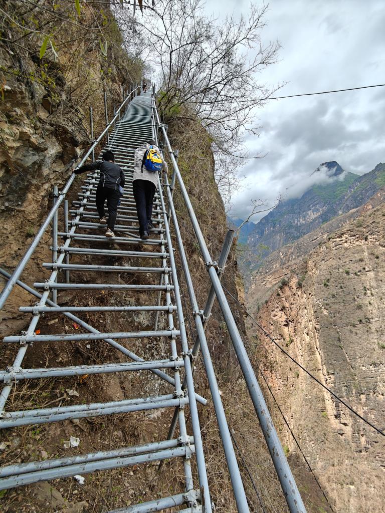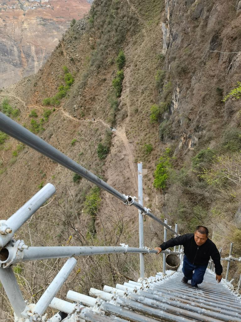 懸崖村因脫貧攻堅而廣受關注,外地許多人自發到這里攀登鋼梯。鋼梯剛開始倒還平緩,翻上幾個拐彎后,就陡峭起來,而且越來越險。鋼梯之上,一個個身影縮為小點,身子懸空,只敢手腳并用,緊緊拽住鋼梯,向上攀去。