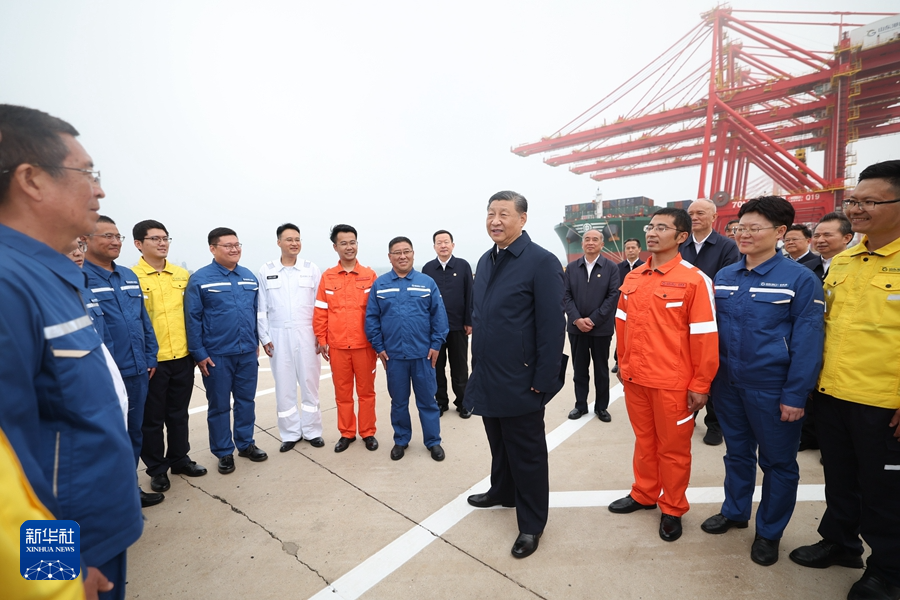 5月22日至24日,中共中央總書記、國家主席、中央軍委主席習近平在山東考察。這是22日下午,習近平在日照港親切慰問港口科技工作者、運營人員、航運人員。新華社記者 謝環馳 攝
