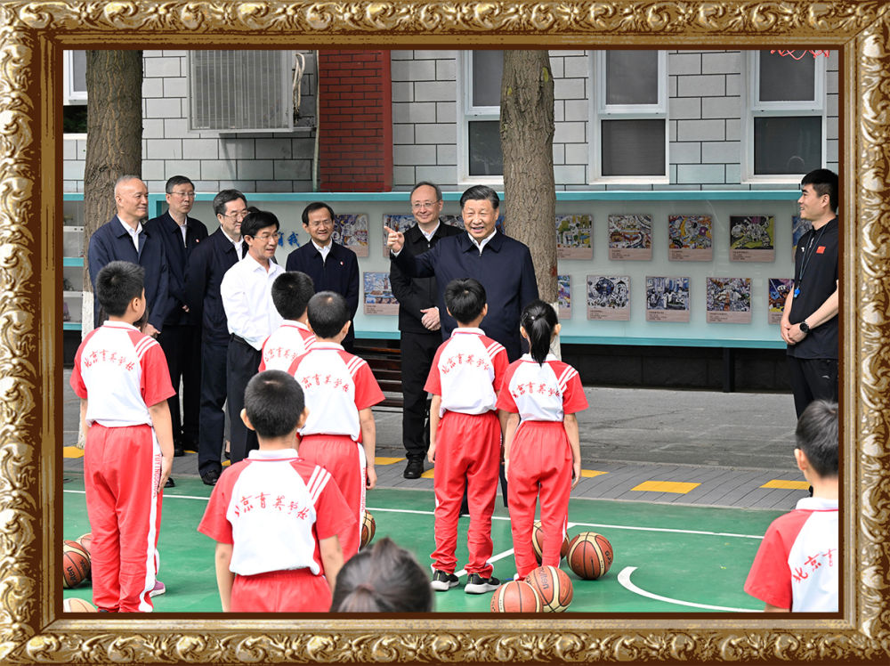2023年5月31日上午,習(xí)近平總書(shū)記來(lái)到北京育英學(xué)??赐繂?wèn)師生,在籃球場(chǎng)同正在上體育課的小學(xué)生們親切交流。習(xí)近平親切地說(shuō):“現(xiàn)在生活條件好了,孩子們不是要吃得胖胖的,而是要長(zhǎng)得壯壯的、練得棒棒的?!?/strong>