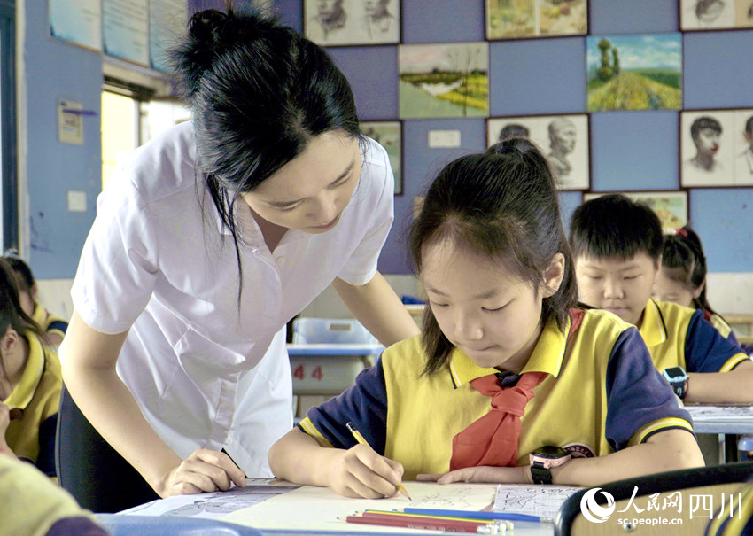 5月31日,南充市嘉陵區之江小學,學生在老師指導下學習繪畫。人民網 趙祖樂攝