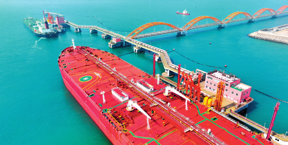在山東港口日照港嵐山港區30 萬噸級油品碼頭,船舶停靠進行卸油作業(2024年3月29日攝)郭緒雷攝 / 本刊
