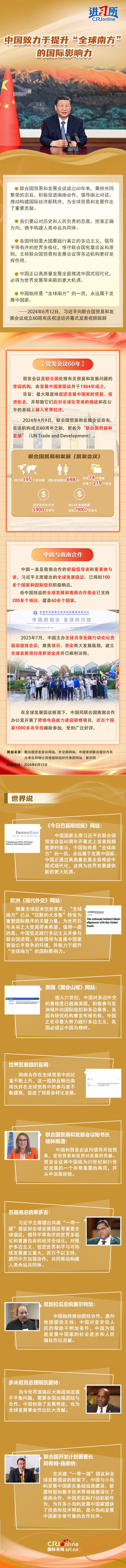 6月12日,中國(guó)國(guó)家主席習(xí)近平向聯(lián)合國(guó)貿(mào)易和發(fā)展會(huì)議成立60周年慶祝活動(dòng)開幕式發(fā)表視頻致辭時(shí)強(qiáng)調(diào),中國(guó)正以高質(zhì)量發(fā)展全面推進(jìn)中國(guó)式現(xiàn)代化,必將為世界發(fā)展帶來新的更大機(jī)遇。