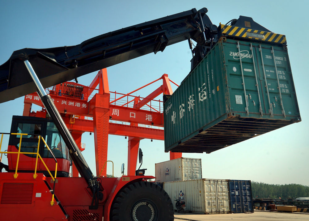2020年8月27日,工人操作機械設備在河南周口中心港碼頭進行吊裝作業。
