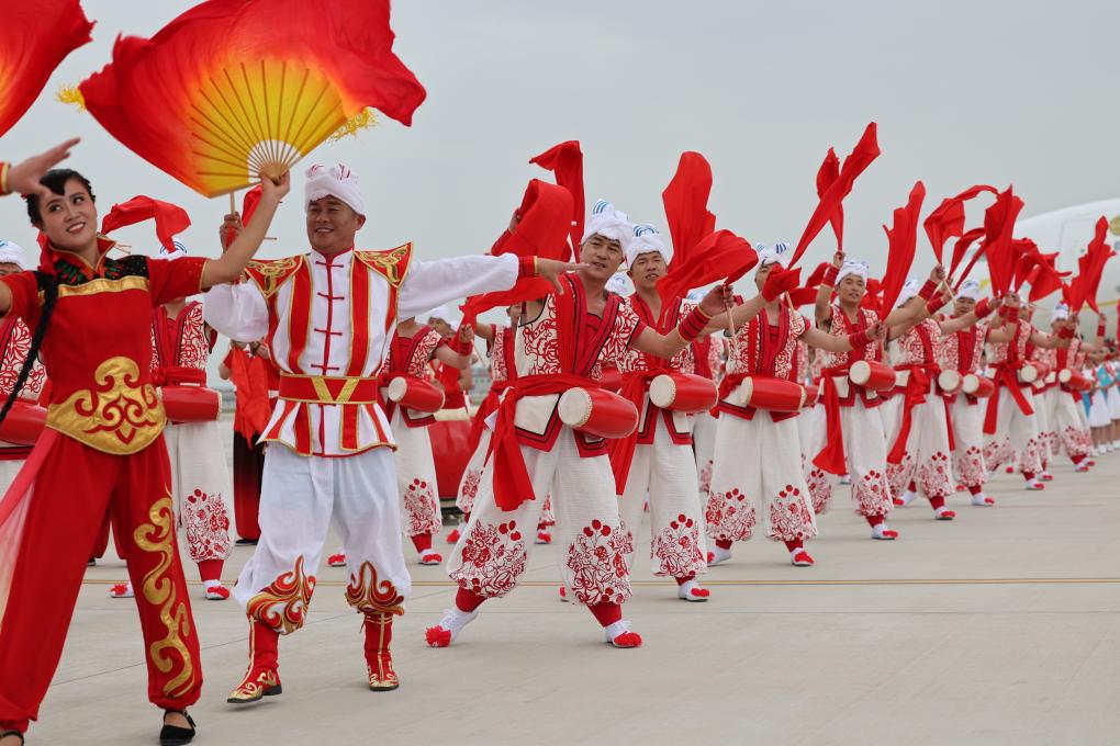 2023年5月17日下午,出席中國-中亞峰會的哈薩克斯坦總統托卡耶夫抵達陜西省西安市。當地民眾以熱情的腰鼓、歡快的秧歌等民間藝術表演歡迎貴賓到來。新華社記者 邢廣利 攝