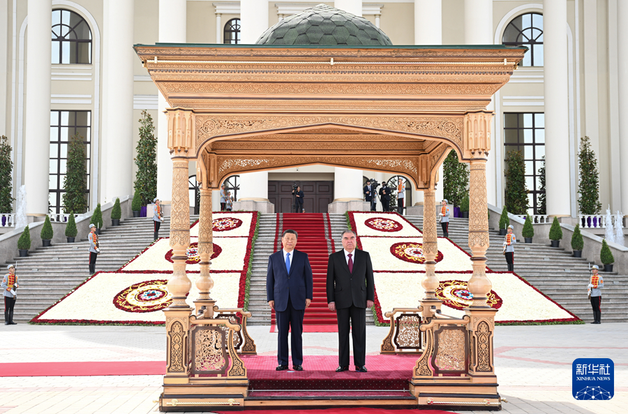 當地時間7月5日下午,國家主席習近平同塔吉克斯坦總統拉赫蒙在杜尚別總統府舉行會談。拉赫蒙為習近平舉行盛大隆重的歡迎儀式。