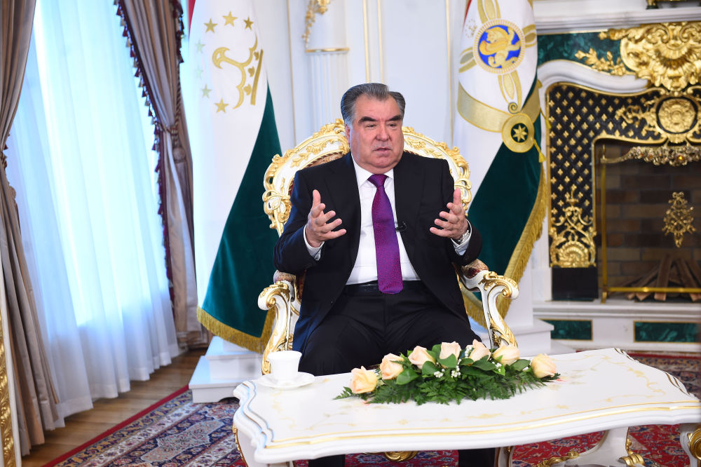 2019年4月13日,塔吉克斯坦總統拉赫蒙在杜尚別接受中國媒體聯合采訪。