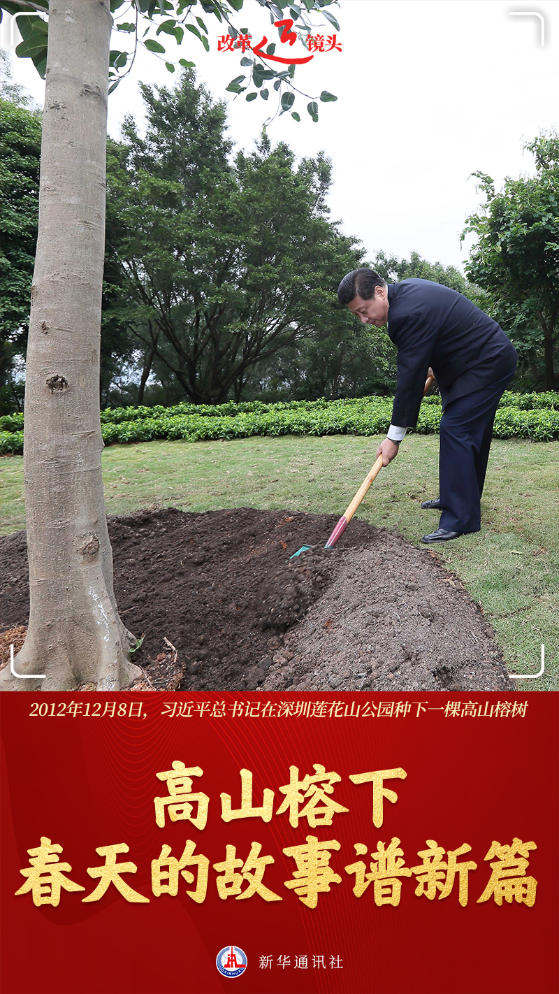 高山榕是嶺南本土樹種,四季常綠、蒼勁挺拔。1992年,鄧小平同志在深圳仙湖植物園也曾親手種下一棵高山榕。“高山榕的特質與堅韌頑強、奮發(fā)向上的改革精神相契合。”時任深圳市蓮花山公園管理處主任楊義標說。