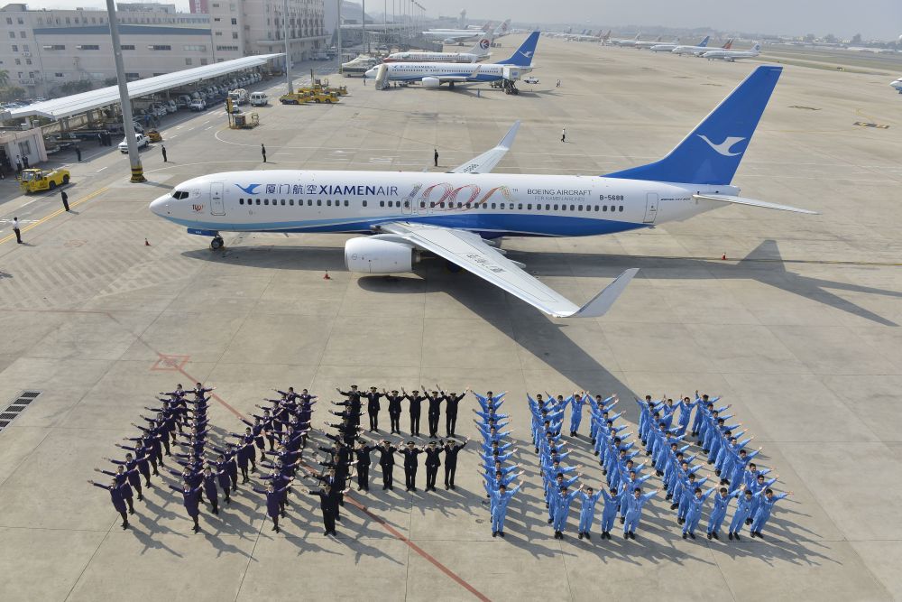 2013年11月16日,廈航機隊規模增至100架,這是廈航員工在機隊第100架飛機前擺出MF100字樣。新華社記者 項開來 攝
