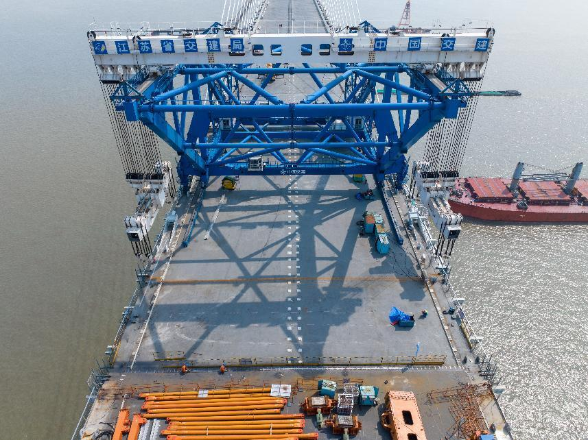 在江蘇,長達1208米的世界最大跨度斜拉橋——常泰長江大橋全橋貫通。建設單位在大橋建設過程中投用了QMD-2000型全球最大噸位橋面吊機,研發了抗拉強度高達2100兆帕的斜拉索,打造出國內首條鋼桁梁全過程智能生產線……依托5G、大數據、物聯網等信息技術,常泰長江大橋建設還實現了對施工全過程的“可知、可測、可控”。