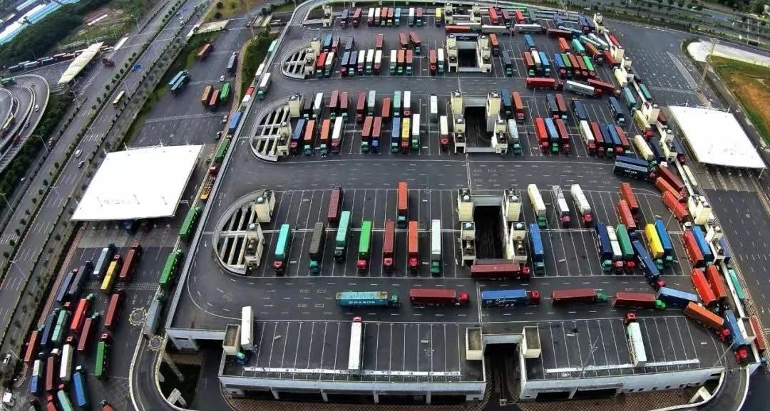 浙江義烏港等待通關的集裝箱貨車