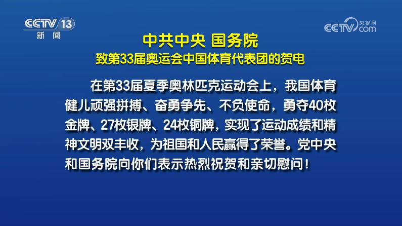 8月11日,中共中央、國務院向第33屆夏季奧運會中國體育代表團致賀電,高度評價我國體育健兒“實現了運動成績和精神文明雙豐收,為祖國和人民贏得了榮譽”。賀電指出,我國體育健兒們以優異成績和出色表現,進一步激發了海內外中華兒女的愛國熱情、振奮了民族精神、凝聚了奮進力量。