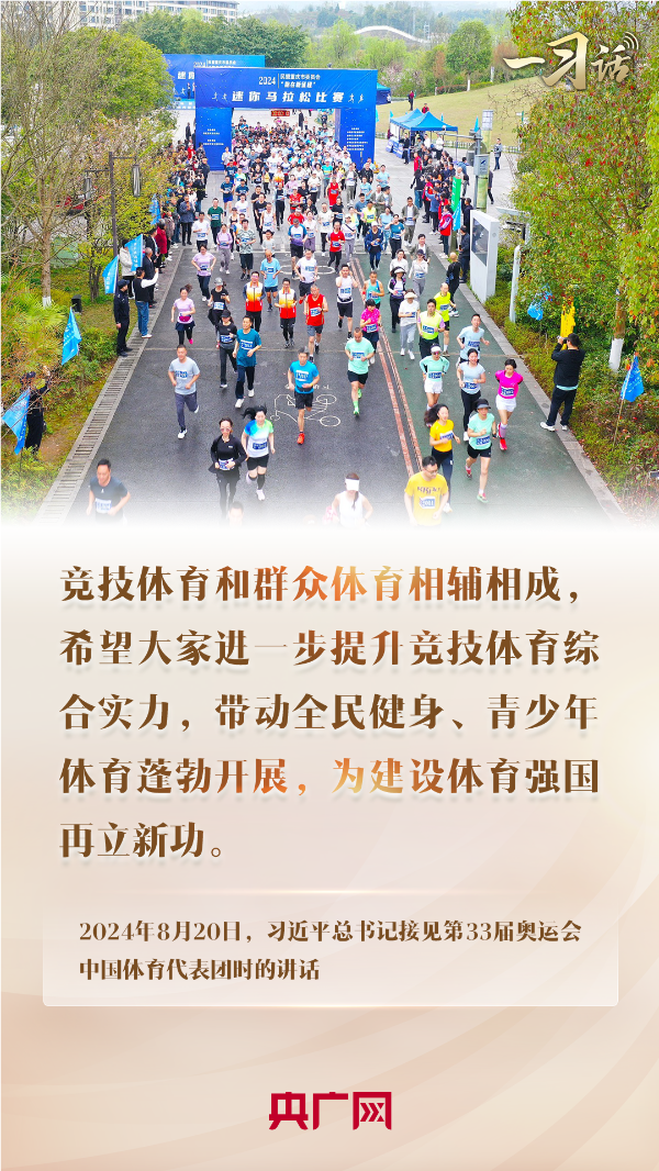 今天,參加各類體育活動正成為我們生活中許多人的一種生活方式。正如前不久奪得首屆奧運大眾馬拉松女子組冠軍的“90后”銀行程序員黃雪梅所說,作為一名業余選手,好成績的取得與生活區周邊越來越好的體育鍛煉環境密不可分。黨的二十屆三中全會提出,要完善全民健身公共服務體系,改革完善競技體育管理體制和運行機制。我們要貫徹落實習近平總書記接見中國體育代表團時的重要講話精神,在進一步提升競技體育綜合實力同時,帶動全民健身、青少年體育蓬勃發展,大力弘揚中國奧運會健兒在本屆奧運會上展現出的中華體育精神,共同推動體育強國和健康中國的發展。