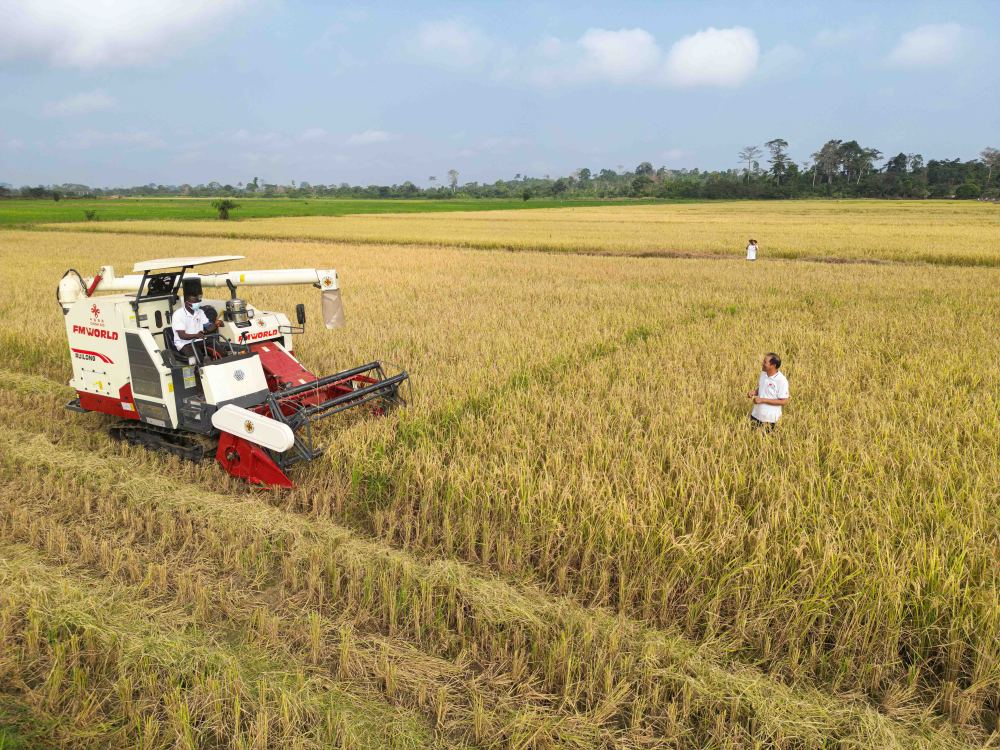 2024年1月8日,在科特迪瓦南部迪沃省格格杜墾區,中國援科農業技術合作組組長郭長友(右一)指導稻農駕駛收割機收割水稻(無人機照片)。格格杜墾區是中科兩國農業合作示范基地,也是科特迪瓦全國聞名的水稻種植基地。