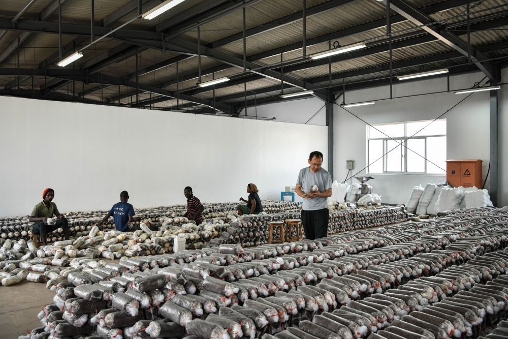 2024年8月13日,在盧旺達南方省胡耶區的中國援盧農業技術示范中心,菌草專家陳曉斌(右)檢查菌袋。自菌草技術引入盧旺達以來,當地菌草產業發展迅速,不僅為市場提供了豐富的食用菌產品,還創造了大量就業機會。