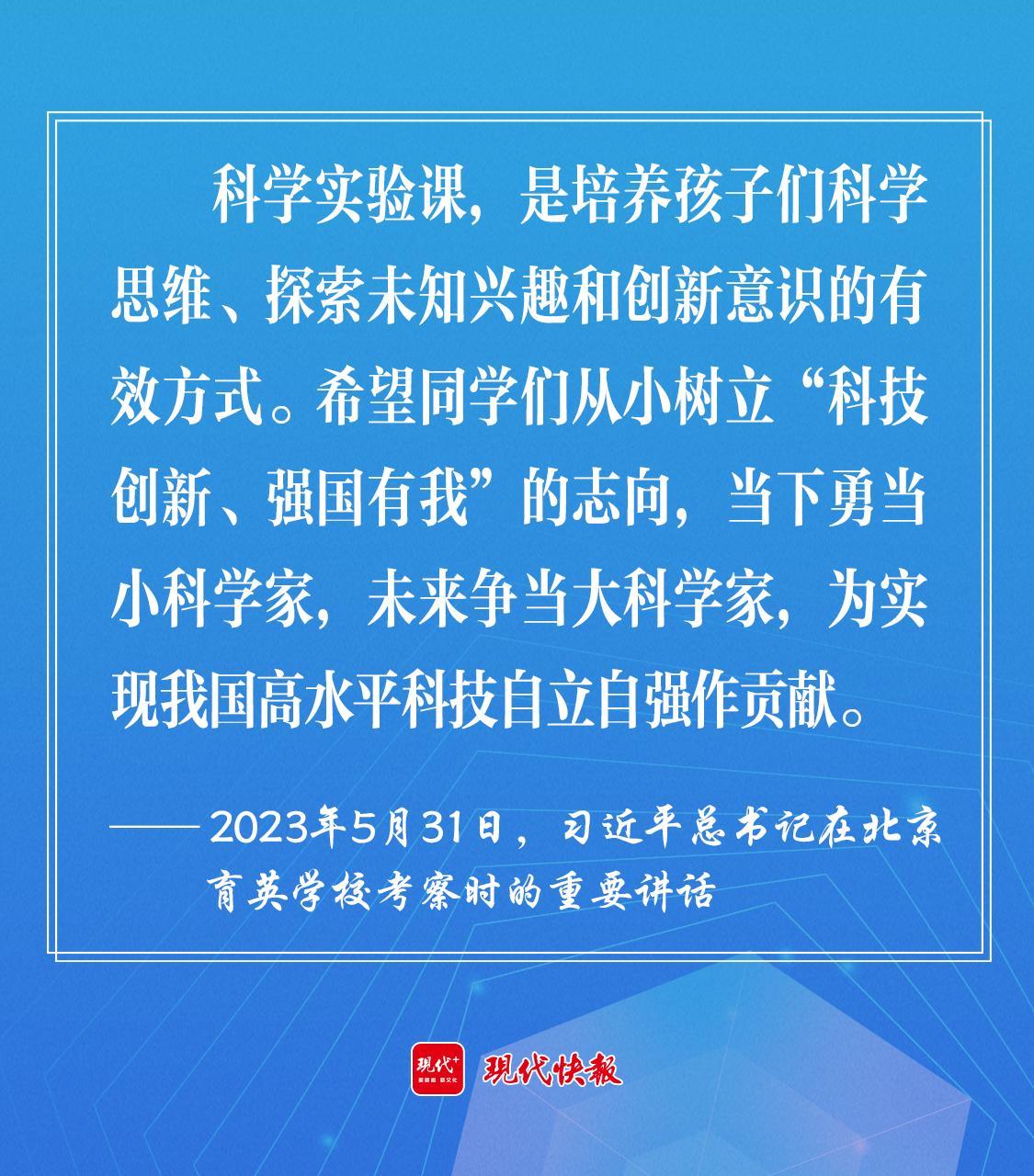 2023年5月,習近平總書記在北京育英學校考察時強調,希望同學們從小樹立“科技創新、強國有我”的志向,當下勇當小科學家,未來爭當大科學家,為實現我國高水平科技自立自強作貢獻。