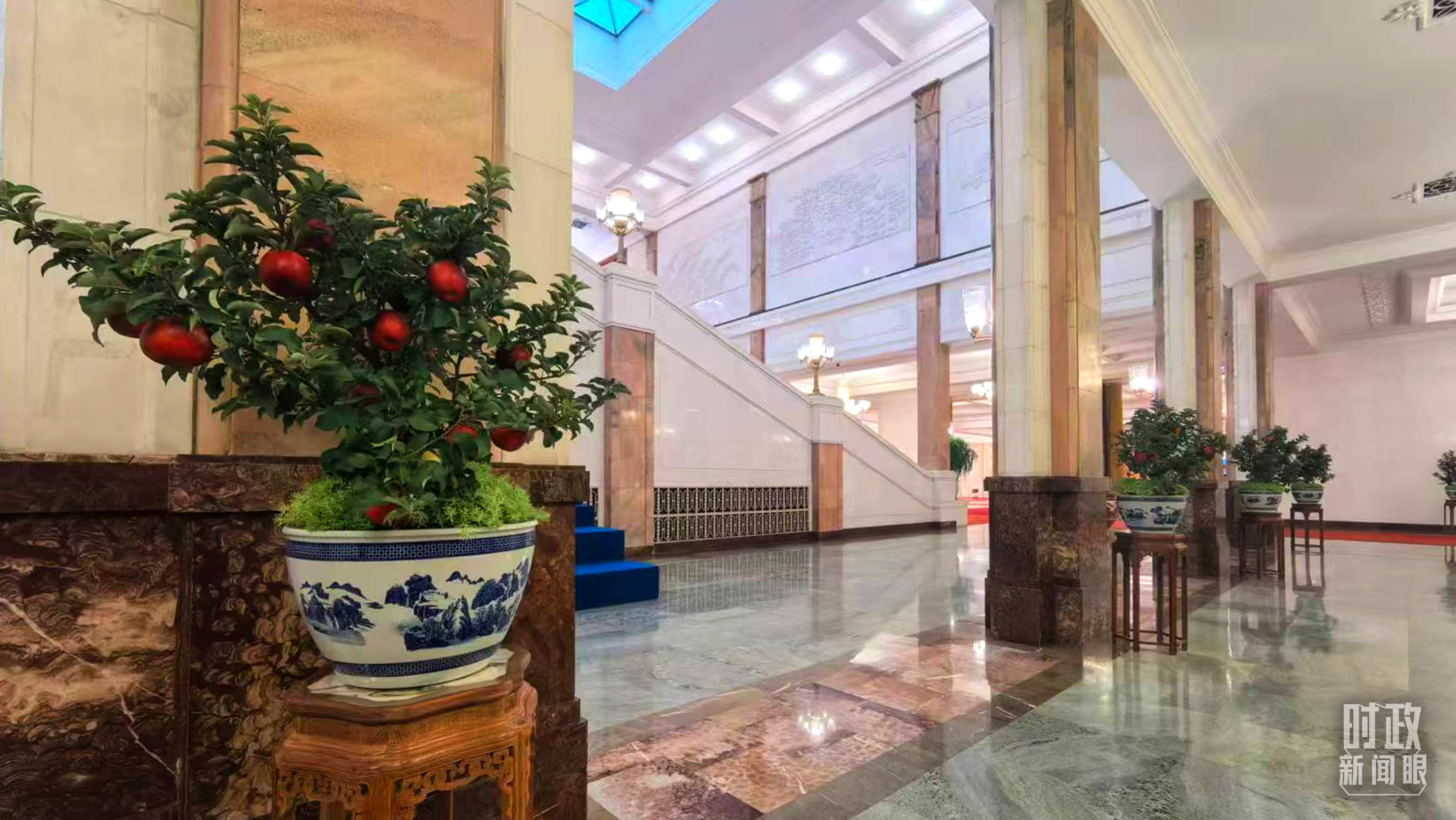 △大會(huì)堂內(nèi)的“碩果累累”盆栽。(總臺(tái)國廣記者吳倩拍攝)