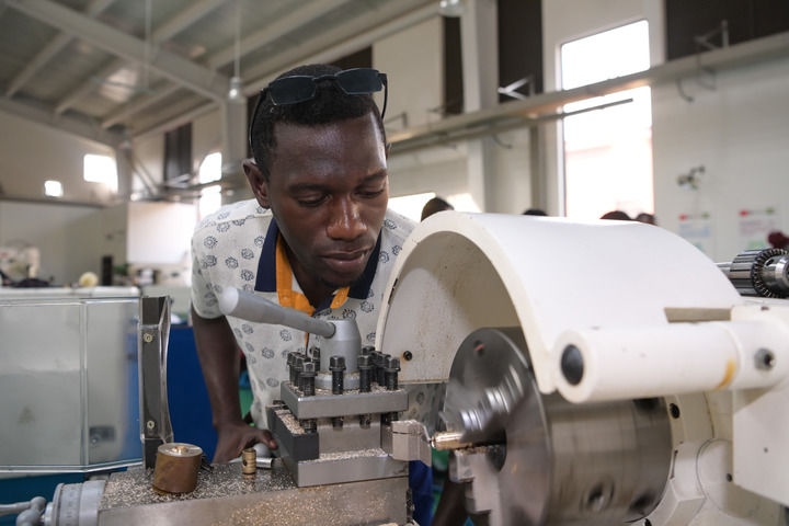 2023年1月10日,在加蓬首都利伯維爾的恩考克經濟特區,恩考克國際職業教育和培訓中心(由中國航空技術國際控股有限公司聯合成都航空職業技術學院等院校共建)的學生進行車削加工操作訓練。新華社記者 韓旭 攝