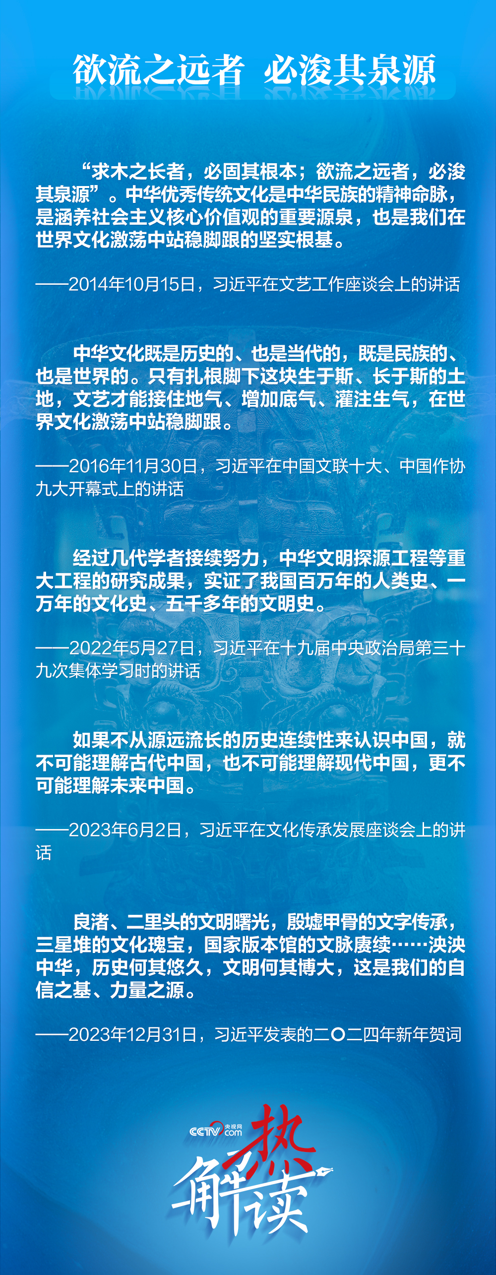 一件件文物、一處處文化古跡、一項項文化藝術,串連起中華民族的文化史,蘊藏著“何以中國”的文化力量。總書記對中華文明之源的關注,彰顯的正是他對推動文化繁榮、建設文化強國的深刻思考和文化自信。