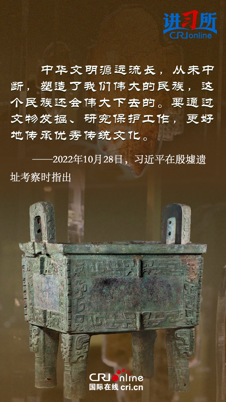 文物和文化遺產承載燦爛文明,傳承歷史文化,維系民族精神。三星堆博物館、殷墟遺址、敦煌研究院……這些年,習近平高度重視中華文明探源工程和文物保護工作,強調要把中華文明歷史引向深入,把中華優秀傳統文化一代一代傳下去。
