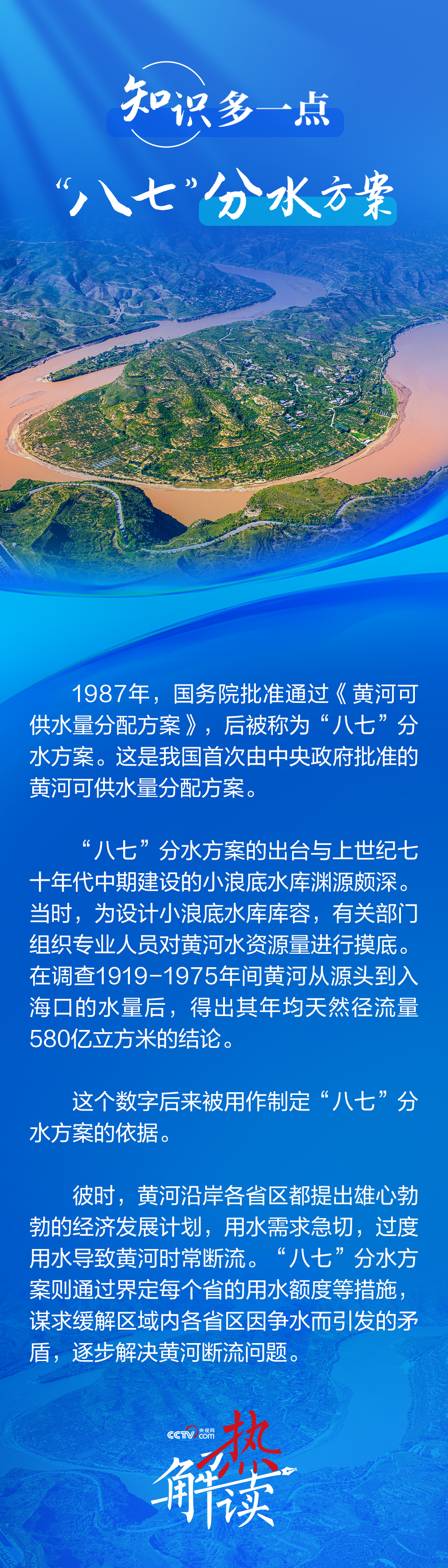 “八七”分水方案是上世紀八十年代我國批準的黃河可供水量分配方案。該方案以1980年實際用水量為基準,綜合考慮了沿黃各省區的灌溉發展規模、工業和城市用水增長以及大中型水利工程興建等因素,來為沿黃各省區分配黃河用水權。“八七”分水方案自1987年國務院批復后沿用至今,未重新調整。