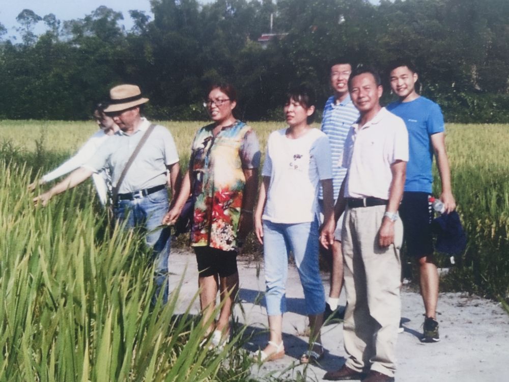 2014年,馬均(右二)帶領學生在永豐村與當地農技人員交流。