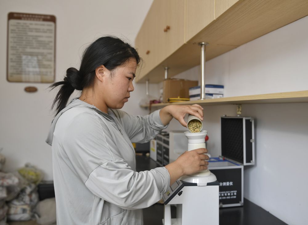 2024年8月22日,在永豐村水稻科技小院,長期駐守在此的四川農業大學學生測量稻谷含水量。