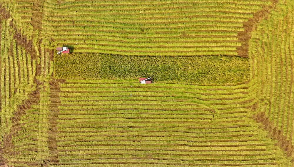 2024年8月22日,收割機在永豐村高標準農田內收割水稻(無人機照片)。團隊預計,2024年永豐村高標準農田平均畝產將接近800公斤。