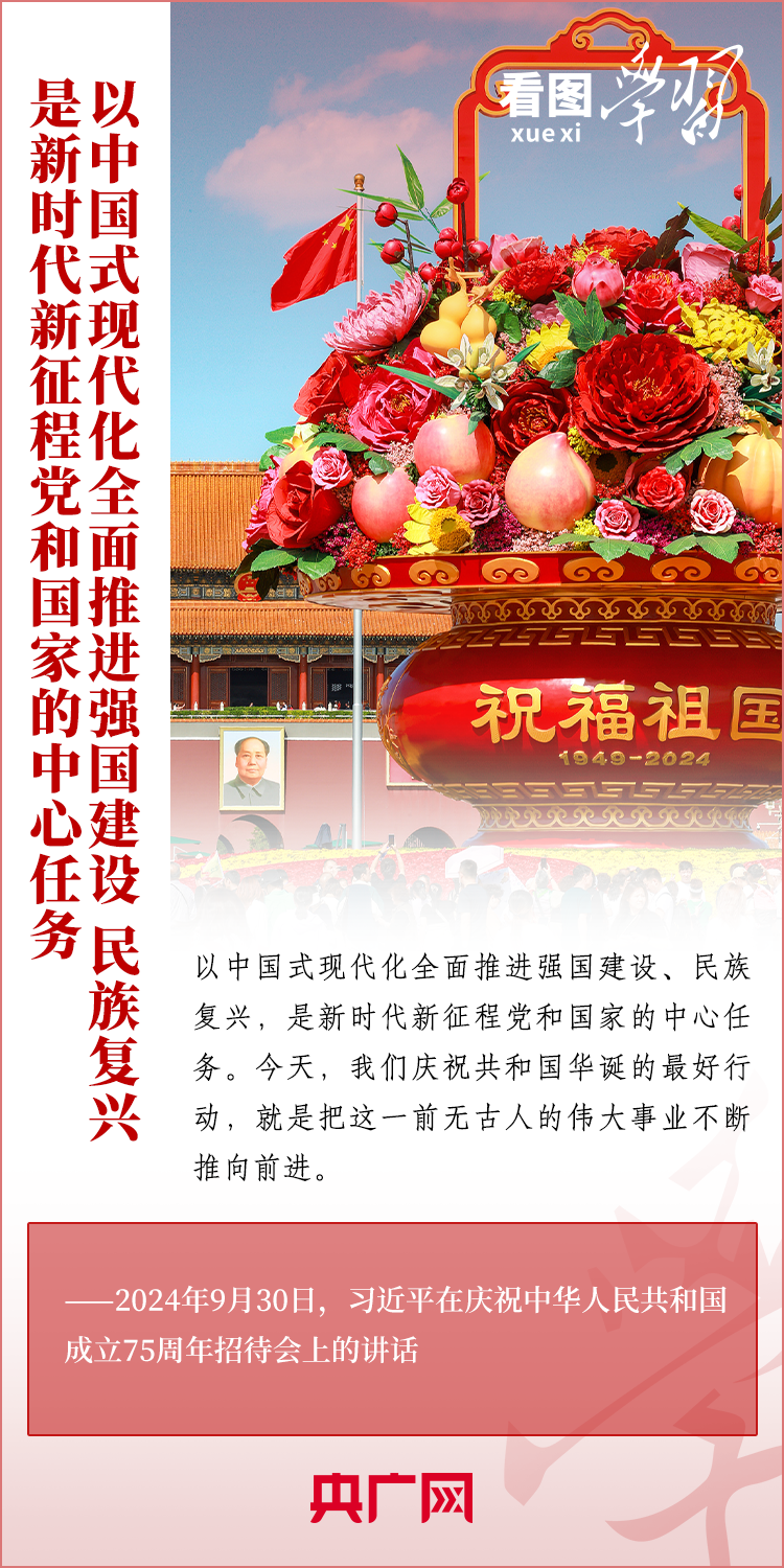 “經(jīng)過75年的艱苦奮斗,中國式現(xiàn)代化已經(jīng)展開壯美畫卷并呈現(xiàn)出無比光明燦爛的前景。”9月30日,慶祝中華人民共和國成立75周年招待會在京舉行。習(xí)近平總書記出席招待會并發(fā)表重要講話。總書記強(qiáng)調(diào),以中國式現(xiàn)代化全面推進(jìn)強(qiáng)國建設(shè)、民族復(fù)興,是新時代新征程黨和國家的中心任務(wù)。我們慶祝共和國華誕的最好行動,就是把這一前無古人的偉大事業(yè)不斷推向前進(jìn)。