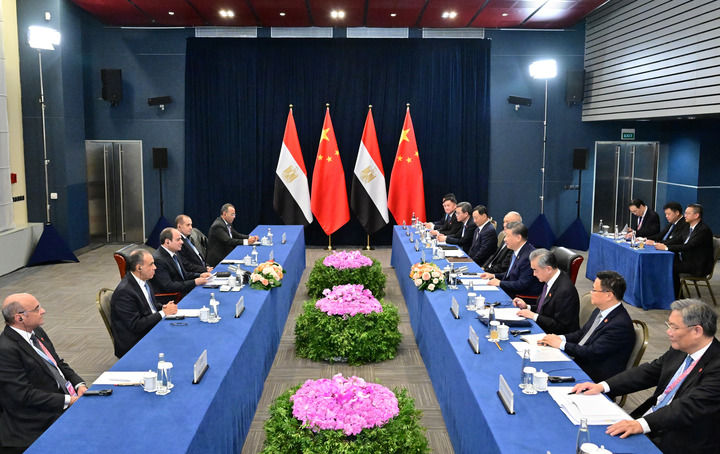 習近平祝賀并歡迎埃及首次作為正式成員參加金磚國家領導人會晤。習近平指出,今年是“中埃伙伴年”和兩國建立全面戰略伙伴關系10周年。中方堅定支持埃及維護國家主權、安全、發展利益,愿同埃方做守望相助的真誠朋友、攜手發展的親密伙伴。雙方要繼續堅定相互支持,鞏固政治互信,深化務實合作,高質量共建“一帶一路”,密切人文交流,推動雙邊關系朝著構建面向新時代的中埃命運共同體目標持續邁進。中方也愿同埃方加強協調,推動“大金磚合作”行穩致遠,進一步提升全球南方影響力和發言權,維護發展中國家共同利益。
