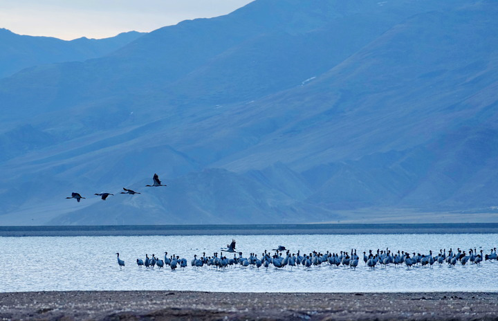 在雅魯藏布江中游河谷黑頸鶴國家級(jí)自然保護(hù)區(qū),黑頸鶴飛翔在一片水域上空(2024年3月17日攝)。多年來,西藏各級(jí)黨委政府和對(duì)口援藏省市接續(xù)投入2.4億余元資金開展生態(tài)建設(shè),創(chuàng)設(shè)的雅江北岸南木林生態(tài)示范區(qū)已完成造林4萬多畝,昔日戈壁荒灘漸變江畔綠洲,也成了黑頸鶴越冬的理想棲息地。監(jiān)測(cè)數(shù)據(jù)顯示,西藏境內(nèi)的黑頸鶴種群數(shù)量持續(xù)增長,已由上世紀(jì)的不足3000只增長到目前的1萬余只。