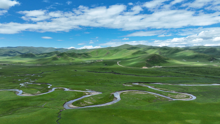 這是2023年7月6日拍攝的甘肅省甘南藏族自治州瑪曲縣阿萬倉濕地景色(無人機(jī)照片)。瑪曲縣是黃河上游重要的水源涵養(yǎng)區(qū)和生態(tài)功能區(qū),被稱為“黃河之腎”。多年來,甘肅省實(shí)施退牧還草、退化草原生態(tài)修復(fù)等治理工程,草原生態(tài)環(huán)境明顯改善。