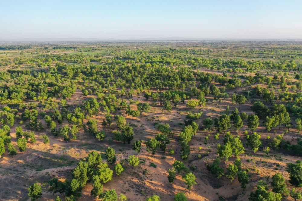 2023年6月14日在內(nèi)蒙古毛烏素沙地拍攝的當(dāng)?shù)啬撩穹N植的一片樹林(無人機(jī)照片)。2024年以來,內(nèi)蒙古全面開展“三北”工程攻堅(jiān)戰(zhàn),已完成防沙治沙面積約1954萬畝,約為年度總?cè)蝿?wù)1730萬畝的113%,超額完成年度任務(wù)。