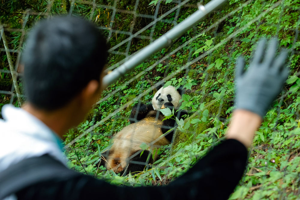 2024年6月24日,在位于大熊貓國家公園臥龍片區(qū)內(nèi)天臺(tái)山的大熊貓第二階段野化培訓(xùn)場(chǎng)外,工作人員給母熊貓“賢賢”投喂完食物后揮手向其告別。近年來,我國通過大力實(shí)施天然林保護(hù)、野生動(dòng)植物保護(hù)和大熊貓國家公園建設(shè)等,保護(hù)大熊貓及其棲息地,成效顯著。大熊貓野外種群總量已從20世紀(jì)80年代的約1100只增長到近1900只。