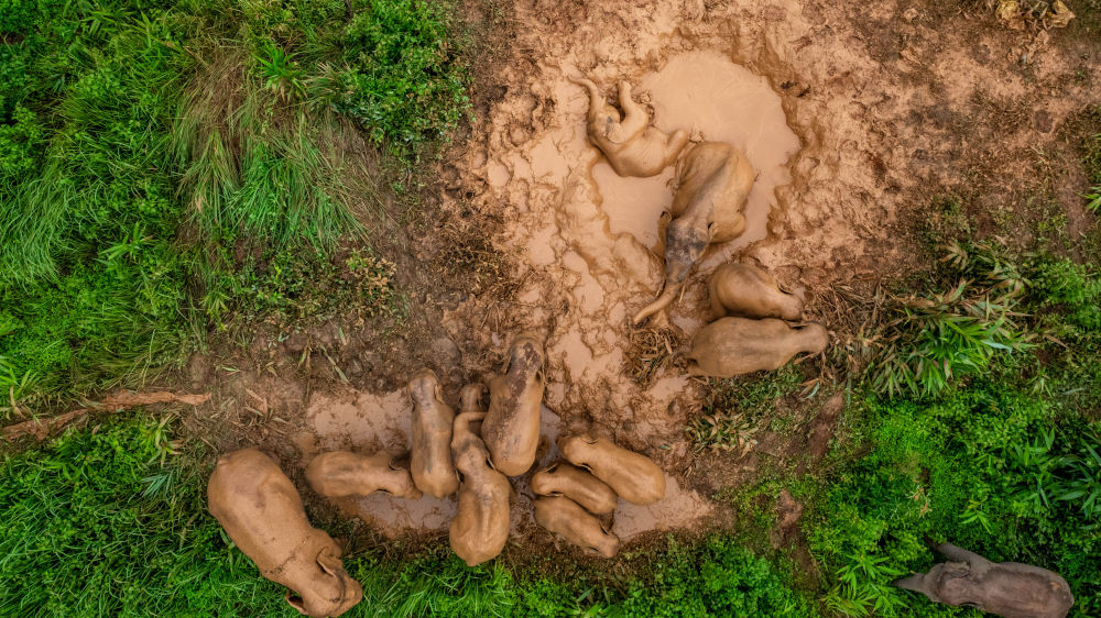 2024年8月8日,“短鼻家族”和“然然家族”的野象在云南省西雙版納州景洪市大渡崗鄉(xiāng)的泥塘里玩耍(無人機(jī)照片)。近年來,云南修復(fù)改造了一些大象棲息地,種植大象愛吃的植物,同時(shí)運(yùn)用紅外相機(jī)等技術(shù)手段,實(shí)現(xiàn)亞洲象位置信息的實(shí)時(shí)發(fā)布。