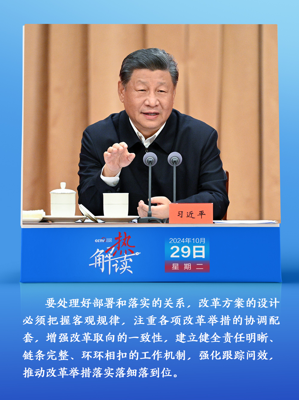 熱解讀10月29日,省部級主要領導干部學習貫徹黨的二十屆三中全會精神專題研討班開班。在開班式上,習近平總書記明確提出要“處理好部署和落實的關系”,“建立健全責任明晰、鏈條完整、環環相扣的工作機制,強化跟蹤問效,推動改革舉措落實落細落到位”。