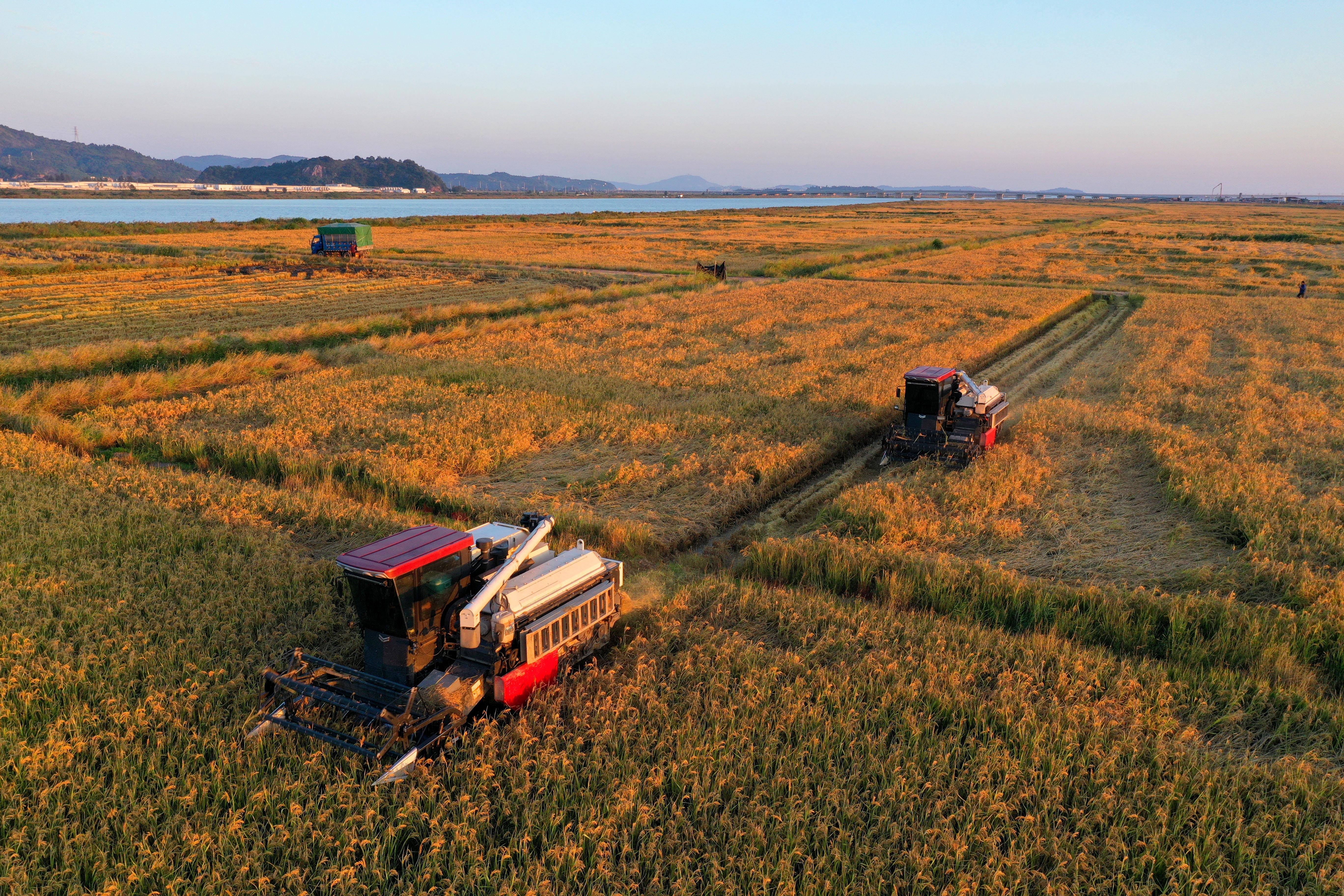 深秋時節,浙江省玉環市漩門三期智慧農業示范基地的海水稻迎來豐收,農民駕駛收割機忙著收割。