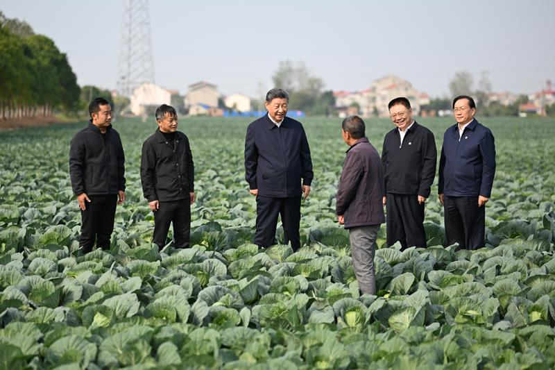 2024年11月5日,習近平總書記在湖北省咸寧市嘉魚縣潘家灣鎮十里蔬菜長廊考察時,同菜農親切交流。
