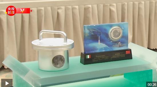 工藝擺件以嫦娥五號探月為設計元素,月球部分裝有月壤??蒲袠悠窞樵氯犁P取樣和鉆取樣,展現了中意航天領域合作高水平。